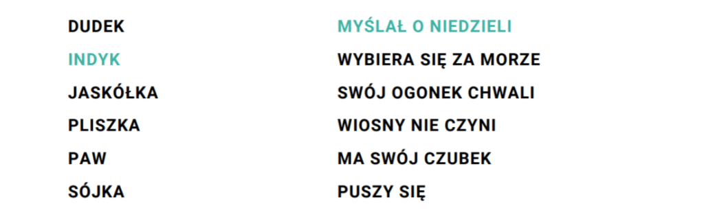 PAPUŻKI NIEROZŁĄCZKI W języku polskim jest dużo powiedzeń i przysłów, których bohaterami są różne ptaki. Połącz w pary nazwy ptaków (znajdujących się w lewej kolumnie) z aktywnością, która do nich najlepiej pasuje (znajdujących się w prawej kolumnie). Każda z par związana jest z jakimś powiedzeniem. Czy pamiętasz, jak dokładnie brzmią te przysłowia? Przykładowo dla „indyka” parą jest fraza „myślał o niedzieli”, a całe powiedzenie brzmi: „Myślał indyk o niedzieli, a w sobotę łeb mu ścięli”.